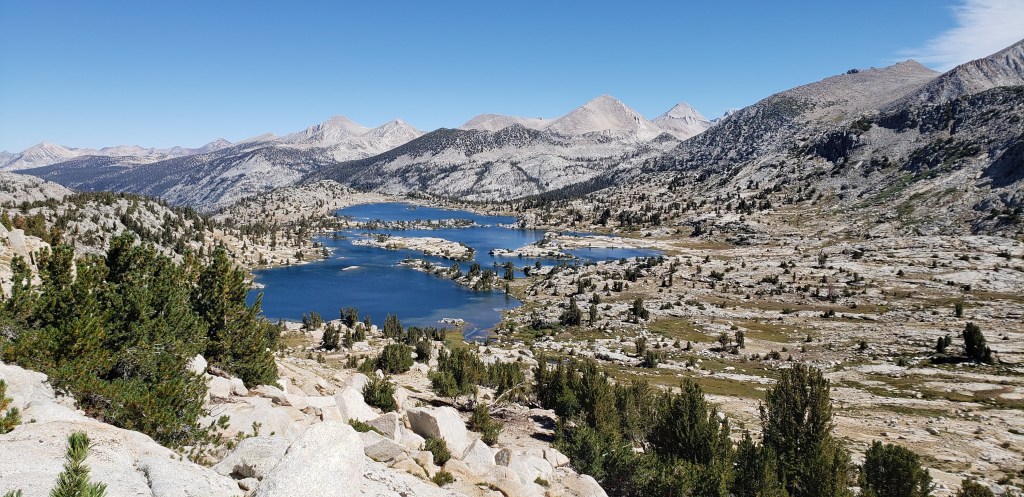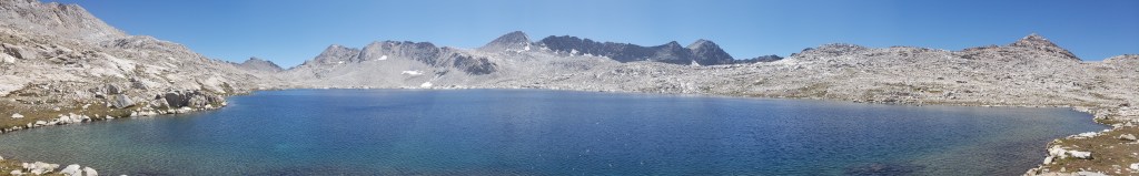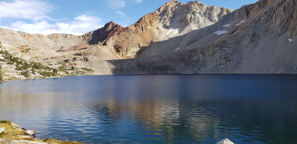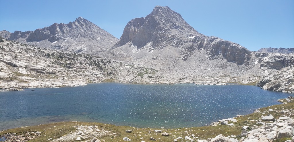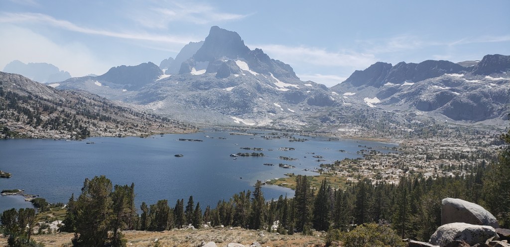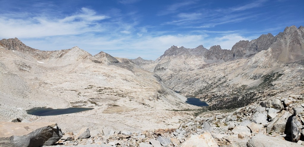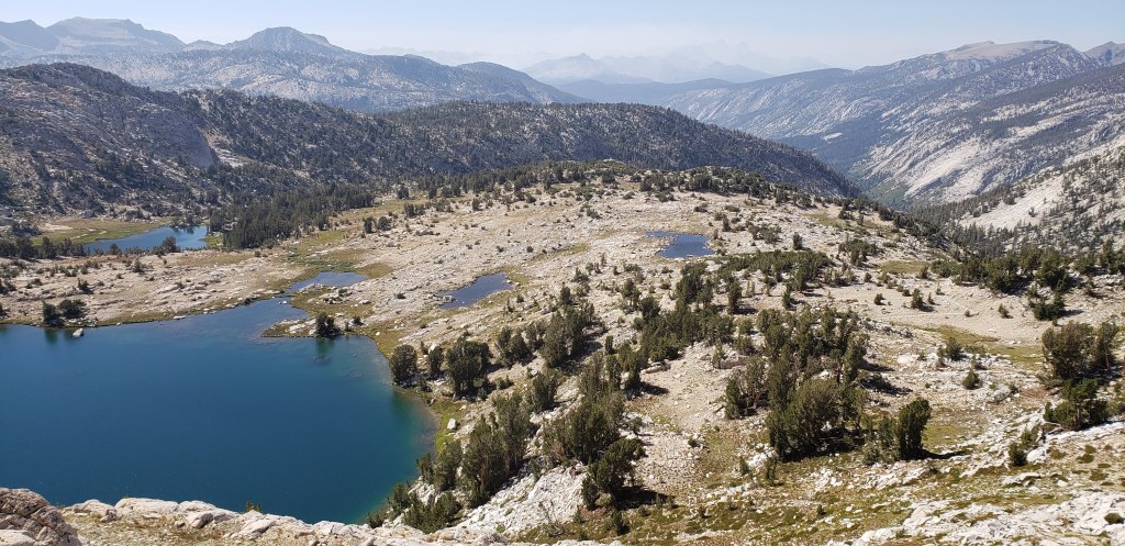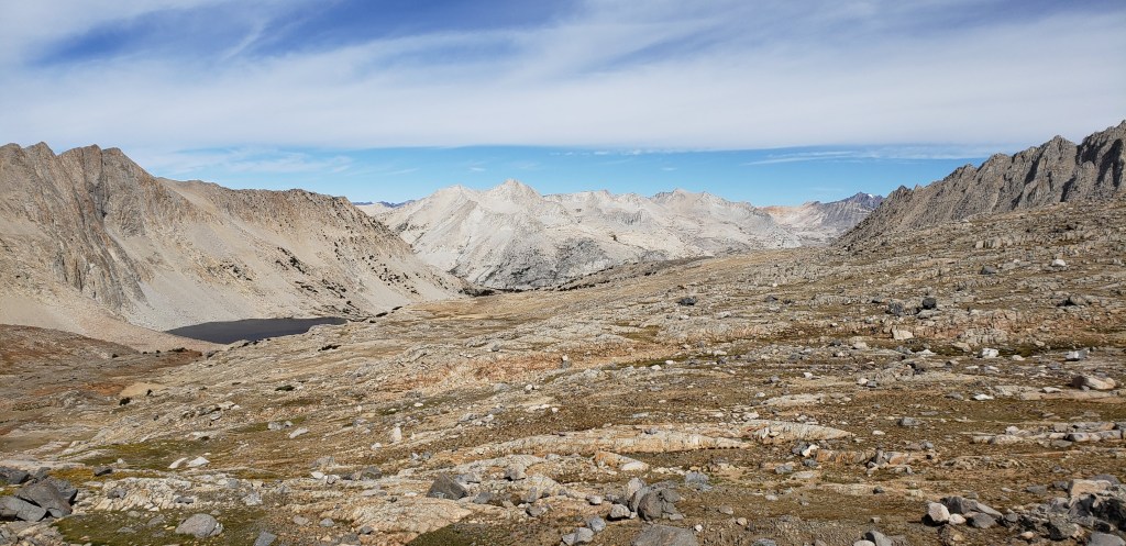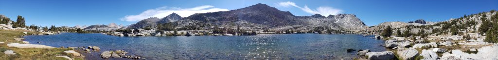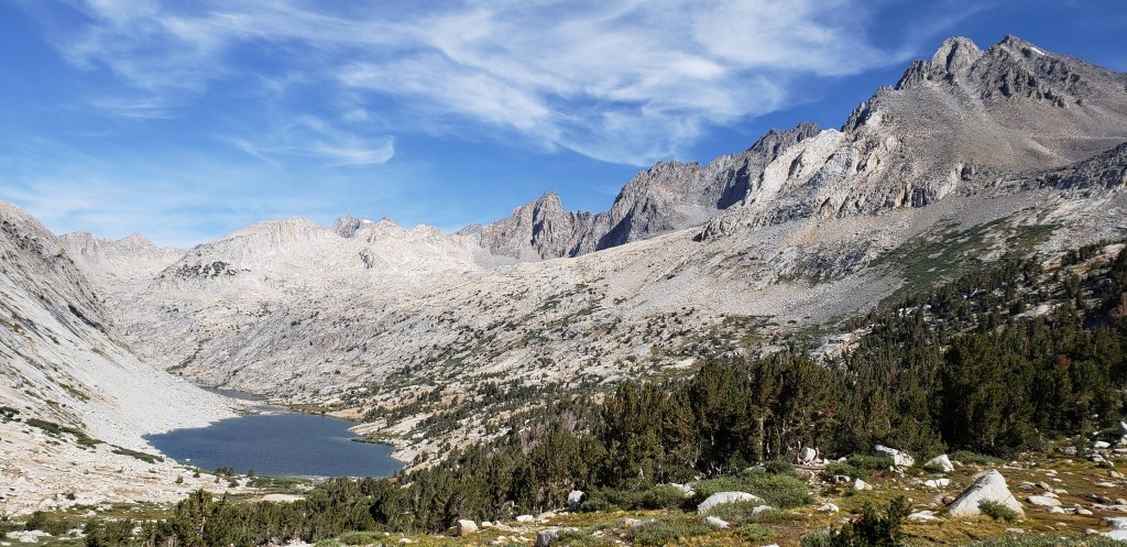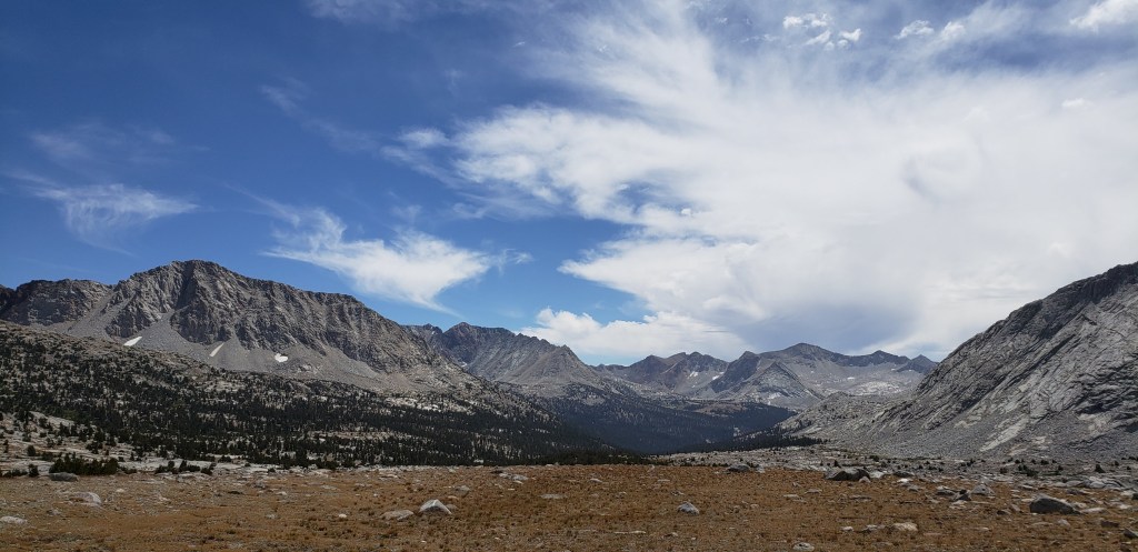 After our customary photo session on Mather Pass, we started to descend and proceed towards an endless stretch of flat trail which would make the day tiring. After the steep descent from Mather Pass, the trail gradually descends for about 5 miles. We did not take an official lunch break today as the trail was much flatter, and we continued on our own pace until reaching the ascent towards Bench Lake. What made our next 4 days more challenging was the ascents that we had to do at the end of the day, so we could get closer to the passes. The only thing we had going during our descent was the beautiful views around us and the first signs of cloud!