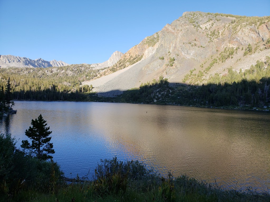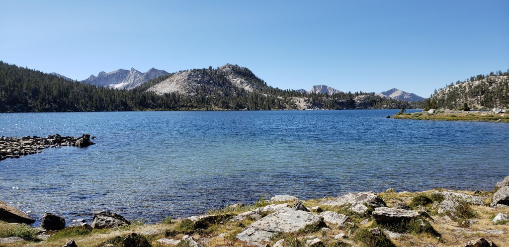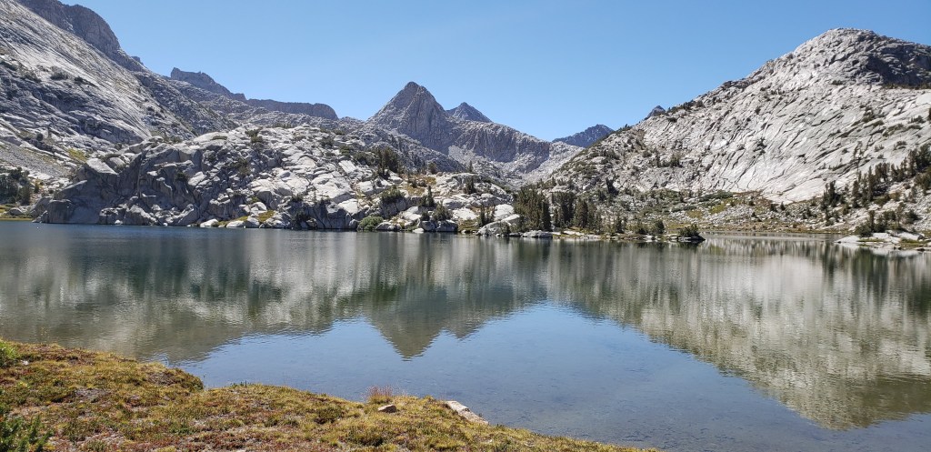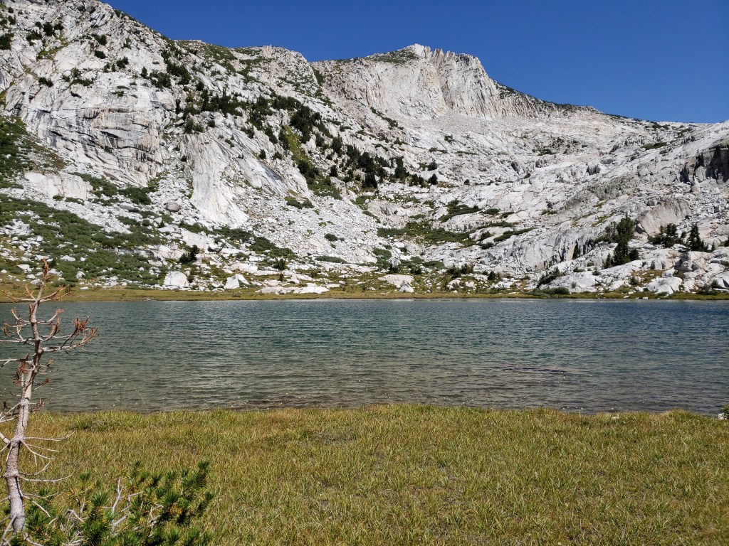 We took a break for about 30 minutes before we could head further. Our usual goal for everyday was to get above the passes before noon so we don’t get caught in unexpected thunderstorms in the Sierra, which we only accomplished 2 or 3 times. From Fish creek footbridge, the trail gradually ascends through shaded area, before you have to make your final ascent towards Squaw Lake. Squaw lake was beautiful and refreshing, given that we were getting tired by the time we got here my buddy decided to dip in the water at Squaw lake while I sat down and enjoyed the beauty of the lake and its surroundings.