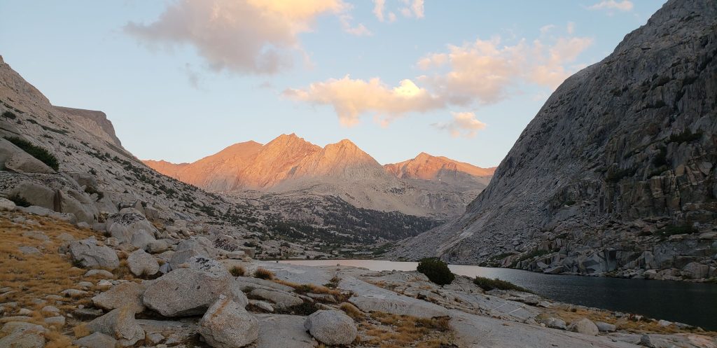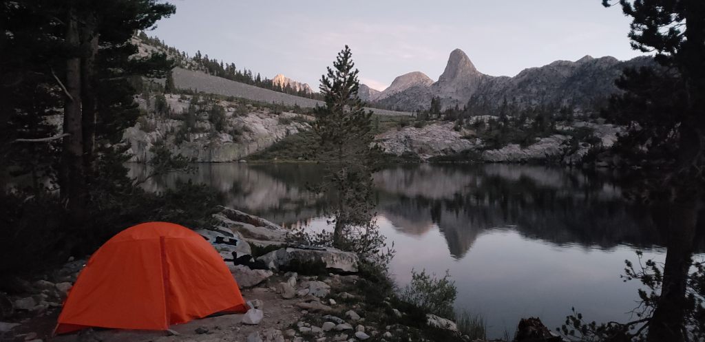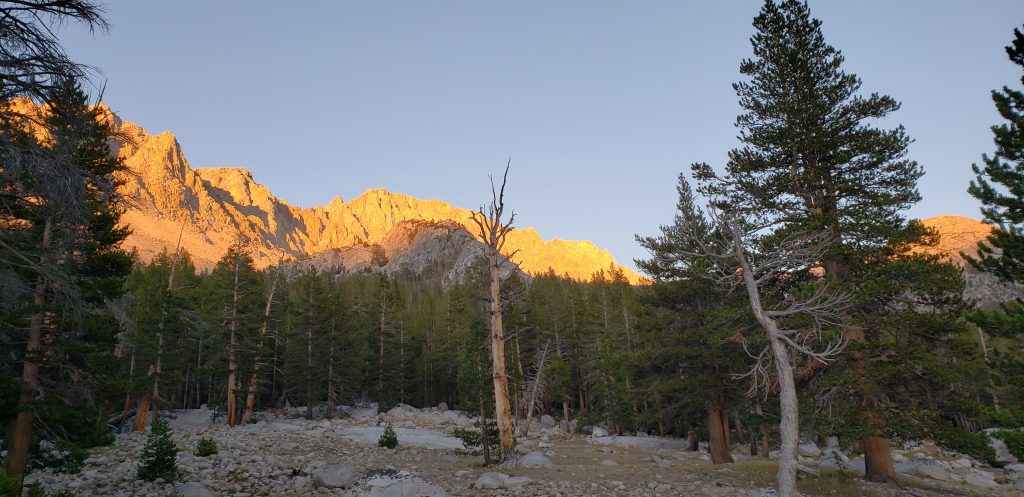 Our goal was to get as much closer to Evolution Lake and camp at the very last camping spot before the ascent towards Evolution Lake. About a half mile into the hike from McClure meadow ranger station, we would eventually pass the Purple Zombies, and would continue along with them for the rest of the day. We reached our campsite at 6:15 pm and had plenty of sunlight left to discuss our plans for the rest of the trip. As we started to share our itinerary with the Purple Zombies they realized that they could stick to our itinerary as well, and skip their planned food resupply at Onion Valley trailhead. We had early dinner and spent the rest of the time enjoying the beautiful sunset!