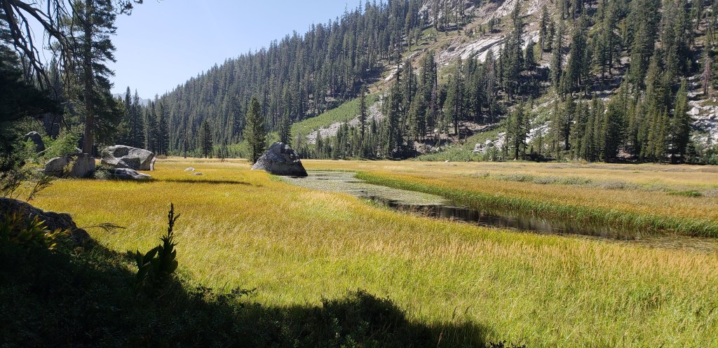 We walked by “Fast and Furious” about half a mile past the High Sierra Trail junction. We continued to gain elevation again as we proceeded towards Crabtree Meadow. Our original plan was to camp within a mile of High Sierra Trail junction, but we ended up hiking up to Sandy Meadow before stopping for the day. We would not realize Sandy Meadow was the last campsite before Crabtree Meadow, until we ran into a fellow camper who would caution us, and we were very thankful. Our campsite at Sandy Meadow was pretty isolated, and we did not enjoy its solidarity until the next day! We went to bed with dreams of completing JMT the next day, which would eventually be a reality!