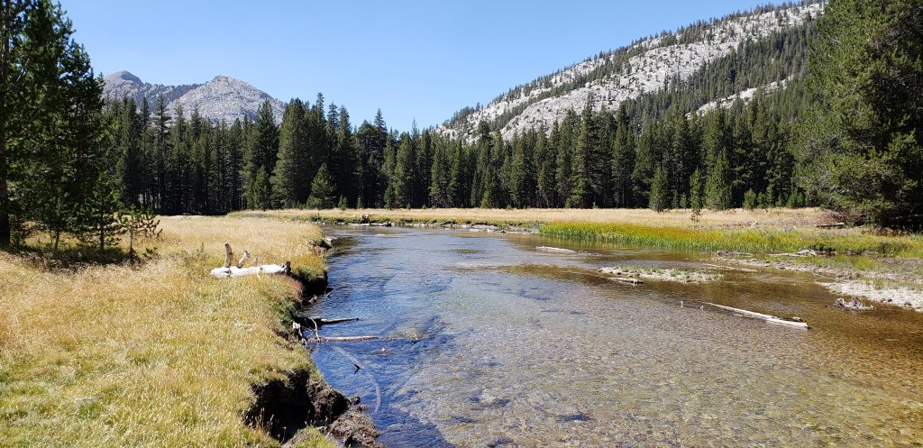 The clock stuck noon, and we had good pace covering the flat stretch. We got over ambitious and started making plans to go beyond our planned camping destination; which was at the foot of Lyell fork crossing facing Mount Lyell. We slowly started picking up elevation and realized what a loaded backpack and elevation can do to us. Our pace that was steady seemed to have come down, and we were no longer hiking but snail-ing. Slow and steady we kept our pace and reached our first camping spot and decided not to go further. It was a wise decision as we needed time to setup camp for the first time, and our body really appreciated the break.
