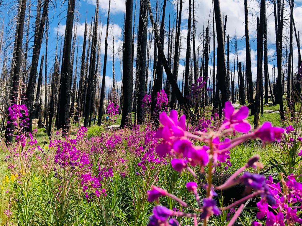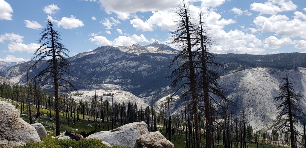 We took a short break on top of Nevada falls and continued on the trail with our next break point set for Clouds Rest trail junction. Once we passed through Little Yosemite valley, we knew the switchbacks getting to half dome junction would be our next big challenge. Thankfully most of the trail here is shaded and we reached clouds rest junction right before noon. The trail up until clouds rest junction was very familiar, and we took our next break at the junction before proceeding on JMT further. The trail gets out of the shade from here until you reach the ascent towards sunrise lakes junction. We continued on the trail as we gained gradual elevation and the landscape dramatically started to change. This part of the trail was burnt down, and it was clearly visible by looking at the tress. Among the burnt down trees were a few flowers that made the landscape look scenic.