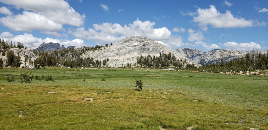 By the time we got through this part of trail, most of us were tired and were looking forward to reaching sunrise high Sierra camp, before making our final push towards TM. We even contemplated taking the sunrise lakes trail back to Tenaya Lake as we were tired. With the hardest part of the trail behind us, we started descending towards sunrise high Sierra camp. About a mile into the descent, the trail opens up into a beautiful meadow, which marks the entrance of sunrise high Sierra camp. The sunrise high Sierra camp did not open this year, so there were not a lot of people around in this area. We took a much needed lunch break here and a short 10-minute power nap as we stared at the 10 more miles board towards TM.
